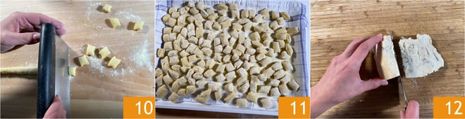 Dividid los rollitos en pequeños trozos de 1 cm 10 con una rasqueta o un cuchillo. A medida que forméis los ñoquis, colocadlos sobre una bandeja con un paño de cocina enharinado 11. Poned una olla de agua al fuego y sal al hervir. Cortad el gorgonzola en trozos 12.