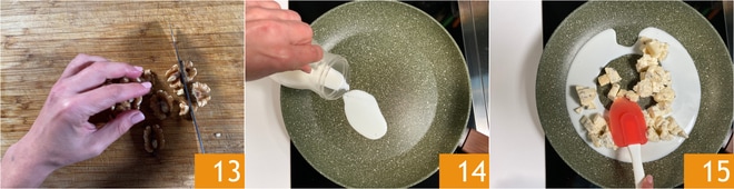 Picar las nueces 13. Calentar la leche a fuego lento en una sartén 14, añadir el gorgonzola y remover para derretirlo 15.