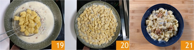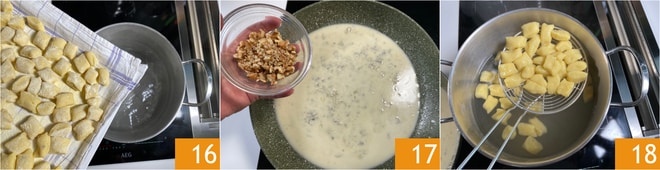 Coced los ñoquis en agua hirviendo 16 y esperad a que salgan a la superficie. Mientras tanto, añadid las nueces al condimento 17. Escurrid los ñoquis 18.