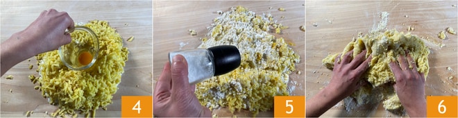 Agregad también el huevo entero 4, la sal 5 y comenzad a amasar con las manos 6 hasta obtener una masa firme y compacta.