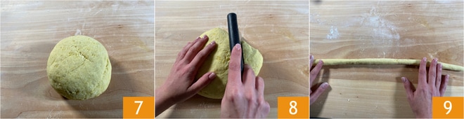 Formad un bloque homogéneo 7, luego tomad porciones 8 y formad rollitos 9, espolvoread con la sémola.