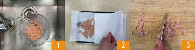 Para preparar las nubes de dragón, lave los camarones bajo agua corriente 1 y séquelos con papel de cocina 2, luego píquelos finamente 3.