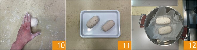 Divida el bloque por la mitad 10 y forme dos cilindros de unos 4 cm de diámetro, asegurándose de que la masa no presente burbujas 11. Luego colóquelos en una cesta para cocer al vapor 12.