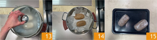 Cubra con la tapa 13 y cocínelos al vapor durante una hora a fuego medio. Puede usar una vaporera clásica o la tradicional cesta china de bambú. Al final de la cocción 14 deje enfriar la masa, luego envuélvala en un film de plástico y colóquela a reposar en el refrigerador durante 12 horas 15. Como alternativa, puede dejarla en el congelador por un par de horas.
