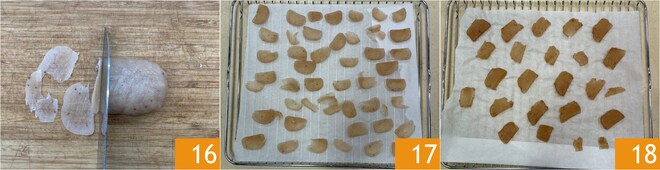 Corte la masa en rodajas muy finas 16. Disponga las chips en una bandeja forrada con papel de horno 17 y, para secarlas, hornéelas en horno ventilado a 60° durante una hora. Luego deje reposar las rodajas por otra hora 18.
