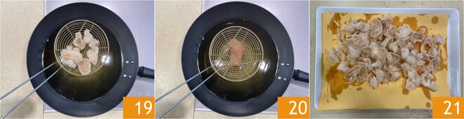 Caliente el aceite de semillas en una sartén o en un wok. Cuando haya alcanzado una temperatura entre 150 y 180°, sumerja las chips 19 hasta que estén hinchadas y crujientes. Escúrralas con una espumadera 20 y colóquelas en una bandeja forrada con papel absorbente para secar el exceso de aceite 21. Sirva las nubes de dragón inmediatamente.