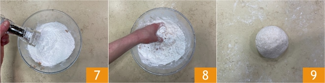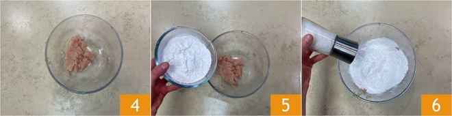 Transfiera la puré obtenida a un bol 4, incorpore la harina de tapioca 5 y sal 6.