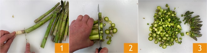 Para preparar las nubes de huevos y espárragos, lo primero que hay que hacer es dedicarse a la Cómo limpiar los espárragos. Eliminad la base leñosa de los espárragos 1 y luego cortadlos en rodajas 2, manteniendo enteras las puntas 3.