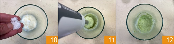 Ajustad de sal 10 y pimienta, luego triturad 11 con una batidora de mano hasta obtener una crema lisa y homogénea 12.