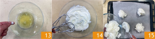 Pasad a los huevos: separad las claras de las yemas, procurando mantener estas últimas íntegras. Colocad las claras en un bol y encended las varillas, luego añadid una pizca de sal 13 y continuad montando; debéis obtener una consistencia espumosa y elástica 14. Dividid la mezcla obtenida en 4 montoncitos y colocadlos en una bandeja forrada con papel de horno 15.
