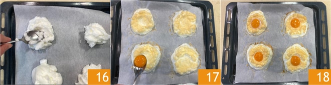 Con el reverso de una cuchara, cread unos huecos en el centro que servirán para colocar las yemas 16 y tratad de darles también forma. Coced en horno estático a 200° durante 6 minutos. En este punto, sacad del horno y dejad deslizar suavemente las yemas en los huecos 17, luego volved a meter al horno y coced durante otros 2-3 minutos 18.