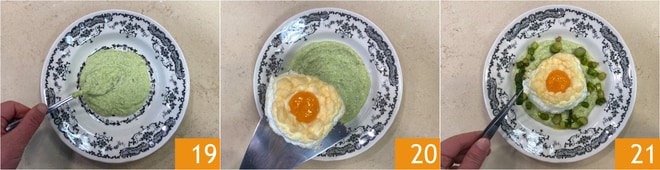 Estáis listos para emplatar: distribuid la crema de espárragos en la base del plato 19, luego colocad encima la nube de huevo 20 y poned alrededor los espárragos salteados 21.