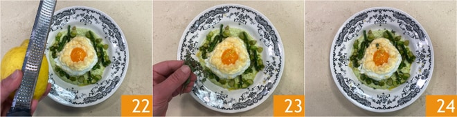 Adornad con la ralladura de limón 22, unas hojitas de tomillo fresco 23 y una pizca de pimienta negra. ¡Vuestras nubes de huevos y espárragos están listas para ser servidas! 24