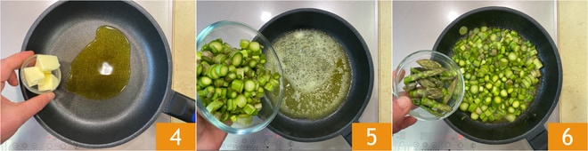 En una sartén, derretid la mantequilla en el aceite 4. Añadid los tallos de los espárragos 5 y cocinad a fuego medio durante 2 minutos, luego agregad también las puntas 6. Saltead todo durante unos 7 minutos, así quedarán crujientes.
