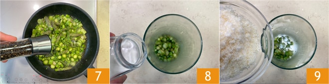 Salad y pimentad 7. Tomad la mitad de los espárragos y pasadlos a un vaso, luego añadid la nata 8 y el Parmesano rallado 9.