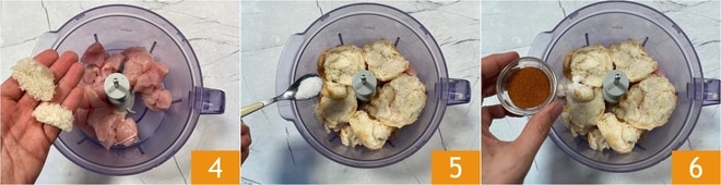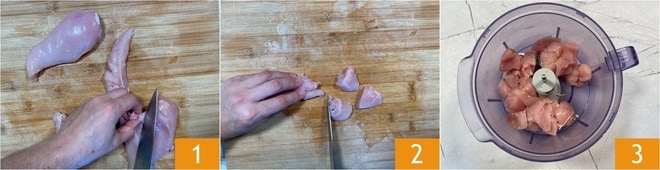 Para preparar los nuggets en freidora de aire, comenzad limpiando la pechuga de pollo de huesecillos y grasa 1. Una vez limpia, cortadla en trozos de 3 centímetros 2 y transferidlos a un procesador de alimentos con cuchillas 3.