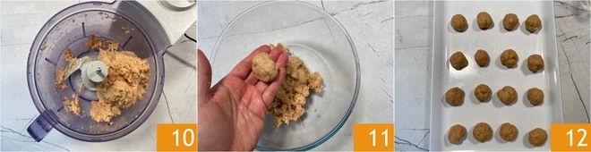Batid todo hasta que la mezcla se desprenda de las paredes 10 y resulte homogénea. Con las manos húmedas, coged 20 gramos de masa 12, formad bolitas y colocadlas en una bandeja 12. Con estas cantidades obtendréis 16 nuggets.