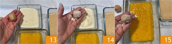 Pasad cada bolita primero por sémola 13, asegurándoos de eliminar el exceso 14. Luego, sumergidla en los huevos batidos 15.