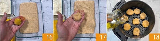 Pasadla por el pan rallado 16, luego dadle la forma clásica modelándola con las manos 16. Colocad los nuggets en la cesta de la freidora de aire y verted el aceite de oliva virgen extra restante 19.