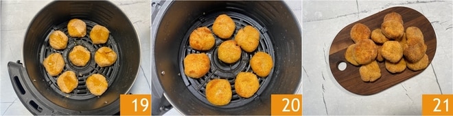 Cocinad durante 14 minutos a 180°, girando los nuggets a mitad de cocción 19. Pasado el tiempo de cocción, los nuggets en freidora de aire estarán dorados y crujientes 20, listos para ser disfrutados 21!