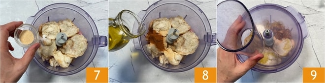 Agregad también la cebolla en polvo 7 y el ajo. Verted el aceite de oliva virgen extra 8 y cerrad el procesador con su tapa 9.