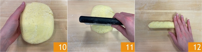 Forma un bloque compacto 10, una vez listo, la masa no requiere tiempo de reposo, pero se puede trabajar de inmediato. Divídela en porciones más pequeñas 11, luego forma cilindros 12.