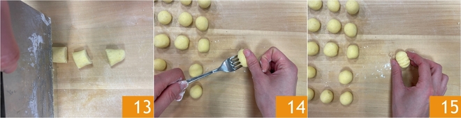 Córtalos en pequeñas piezas de aproximadamente 9 gramos 13. Redondea cada pieza entre las palmas de las manos formando esferas, para facilitarlo, empólvate las manos con almidón de arroz. Si lo deseas, puedes marcarlos ligeramente con un tenedor 14 para darles la clásica forma de ñoquis 15. También en este caso, espolvorea las púas con almidón para obtener una forma bien definida.