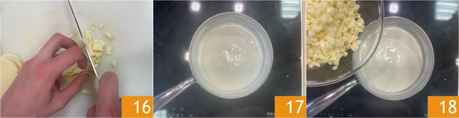 Dediquemos a la salsa de provola. Corta la provola en pequeños cubos 17 y en un cazo vierte la nata, llevándola a una ligera reducción a fuego muy bajo hasta que se haya espesado un 60%, tardará aproximadamente un cuarto de hora. Añade la provola a la nata caliente 18.
