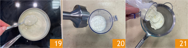 Mezcla hasta su completa disolución 19. Transfiere la mezcla al vaso de la batidora 20, bate hasta obtener una crema lisa y luego pasa por el chino, un colador de malla fina 21 para una consistencia aterciopelada.