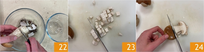 Pasemos ahora a las setas. Cómo limpiar los boletus con un paño húmedo, elimina la parte terrosa con un cuchillo 22 y corta 300 g en cubos regulares 23. Corta finamente los 50 g restantes de porcini 24.