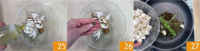 Transfiérelos a un bol y condiméntalos con un chorrito de aceite de oliva virgen extra 25 y una pizca de sal, luego añade algunas hojas de tomillo fresco 26, resérvalos para adornar el plato. Ahora saltea en sartén las setas restantes cortadas en cubos: calienta en una sartén un poco de aceite con ajo, romero y tomillo, luego agrega los porcini en cubos 27.