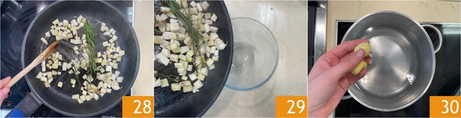 Hazlos dorar a fuego alto durante unos minutos 28, no deben cambiar de color. Transfiérelos a un bol 29 y resérvalos. Mientras tanto, lleva a ebullición una olla con agua salada y añade los ñoquis 30. Cocina hasta que floten a la superficie.