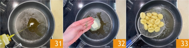 Mientras los ñoquis se cocinan, prepara su condimento: en la misma sartén donde cocinaste las setas, vierte un poco de aceite 31, la mantequilla, el tomillo deshojado y una pizca de pimienta 32. Escurre aquí los ñoquis 33.