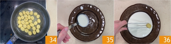 Déjalos sazonar por un instante 34. Ahora estás listo para la composición del plato: vierte un cucharón de salsa de provola en el fondo 35 y coloca encima los ñoquis 36. Si la salsa se ha endurecido, caliéntala en el microondas durante unos segundos.