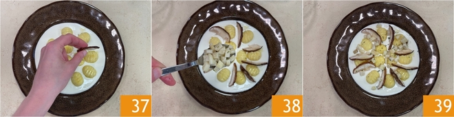 Decora con las rodajas de porcino crudo 37. Añade luego las setas salteadas 38 y completa con un chorrito de aceite de oliva virgen extra en crudo y un toque de pimienta negra. Sirve inmediatamente tus ñoquis con setas y provola 39.