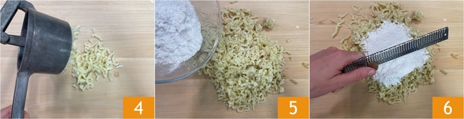 Machácalas con el prensapatatas 4, recogiendo el puré sobre una superficie de trabajo. Añade la sal y el almidón de arroz 5, luego perfuma con una ralladura de nuez moscada 6.