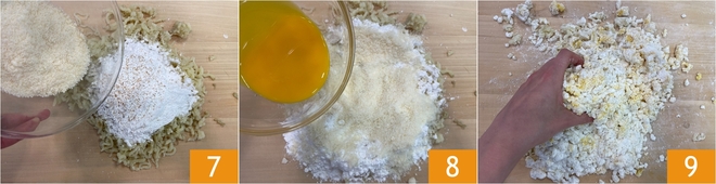 Incorpora el parmesano rallado 7 y finalmente la yema pasteurizada 8. Amasa con las manos 9 hasta obtener una mezcla homogénea.
