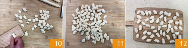 En este punto, podéis rayar cada ñoqui con los dientes de un tenedor o utilizar el utensilio especial para rayar ñoquis 10 para obtener la típica forma rayada 11. ¡Los ñoquis de agua y harina están listos para cocinar 12!