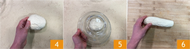 Pasad la masa a la superficie de trabajo y trabajadla hasta obtener una consistencia elástica y homogénea 4; si resulta demasiado blanda, incorporad un poco de harina. Cubridla con un bol 5 y dejadla reposar durante 5 minutos. Volved a tomar la masa y trabajadla con las manos para formar un cilindro 6.