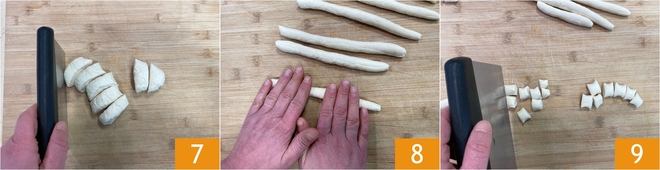 Ahora, con un cortador, divididla en porciones más pequeñas 7. Formad cilindros de aproximadamente 1-2 cm de grosor 8. Luego cortadlos en trozos de unos 2 cm 9.