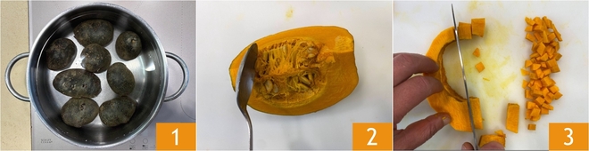 Para preparar los ñoquis de patatas violetas con crema de calabaza y col rizada, primero cuece las patatas violetas partiendo de agua fría, tomará aproximadamente 40-50 minutos dependiendo de su tamaño 1. Mientras tanto, limpia la calabaza 2 y corta la pulpa en cubitos 3.