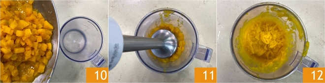 Transfiere la calabaza a un vaso 10 y mezcla con una batidora de inmersión 11 para convertirla en crema 12.