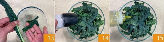 Mantén la crema de calabaza caliente a un lado y pasa a la col rizada: separa las hojas de los tallos 13 y recógelas en un bol, luego sazona con sal 14 y aceite 15.
