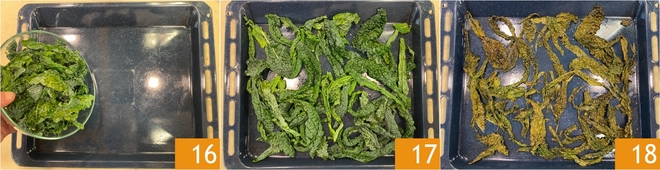 Distribuye las hojas de col rizada en una bandeja de horno 16 y hornea en horno ventilado precalentado a 200° durante unos 15 minutos 17. Pasado este tiempo, las hojas deben quedar secas y crujientes 18.