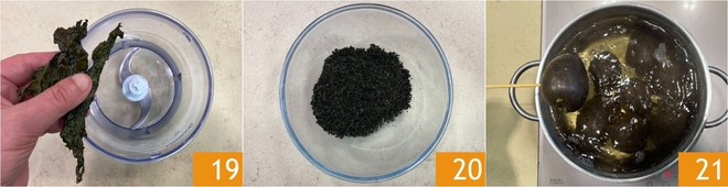 Deja que se enfríen un poco, luego transfiere la col rizada a una batidora 19 y mezcla para reducirla a polvo 20. Reserva el polvo de col rizada y escurre las patatas, que mientras tanto habrán terminado de cocerse, verificando la consistencia con un palillo 21.