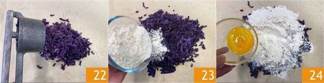 Tritura las patatas en la superficie de trabajo (la piel se quedará dentro del triturador) 22, luego añade la harina 23, el huevo 24 y una pizca de sal.