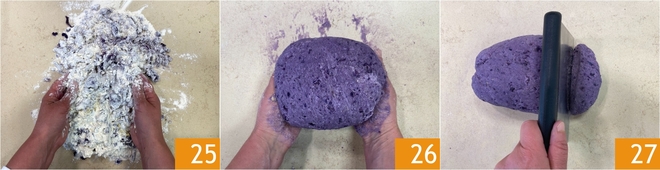Trabaja con las manos 25 hasta obtener una masa compacta y homogénea 26. Divide la masa en porciones más pequeñas con una espátula 27.