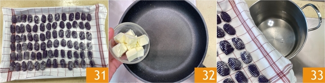 Coloca los ñoquis sobre un paño espolvoreado con sémola, bien separados entre sí 31. Lleva a ebullición una olla de agua con sal para cocinar los ñoquis y mientras tanto derrite la mantequilla en una sartén grande 32. Vierte los ñoquis en el agua hirviendo 33.