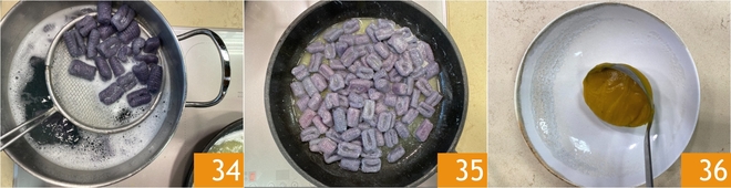 Escurre los ñoquis tan pronto como suban a la superficie 34 y transfiérelos a la sartén con la mantequilla derretida 35, luego saltéalos brevemente para mantecar. Estás listo para emplatar: distribuye la crema de calabaza en el fondo de los platos 36.