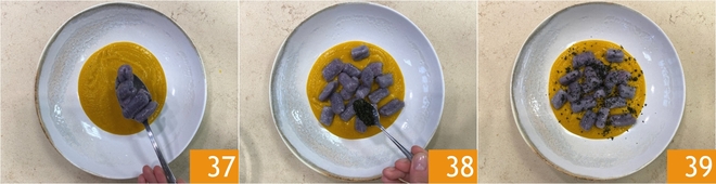 Añade los ñoquis 37 y adorna con el polvo de col rizada 38. ¡Sirve inmediatamente tus ñoquis de patatas violetas con crema de calabaza y col rizada 39!